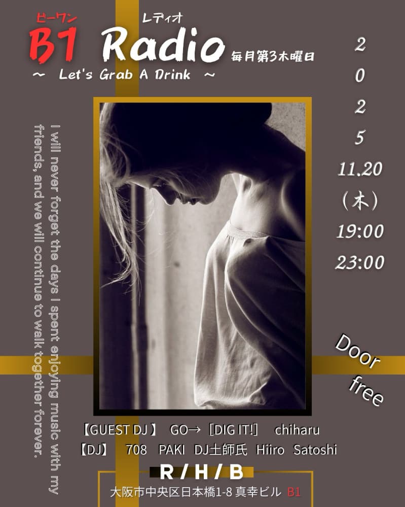 2025.11.20(Thu) B1 Radio 〜Let’s Grab A Drink〜@R/H/B 2025.11.15 2025.11.15 Post Share Hatena Pocket RSS feedly Pin it インフルエンザの予防接種を久しぶりに会社以外で打った。今日病院が行ったところが上手なのか、全然痛くなかった。 2025.11.20(Thu) B1 Radio 〜Let’s Grab A Drink〜@R/H/B 19:00-23:00チャージフリー 【GuestDJ】GO→ 【DJs】708PAKIDJ 土師氏HiiroSatoshi 大阪市中央区日本橋1丁目8 地下1階 Post Share Hatena Pocket RSS feedly Pin it この記事のタイトルとURLをコピーする 2025.11.22(Sat)BIG SATURDAY@亀酒楽(福島区野田 前の記事 The Yum Yums / Poppin’ Up Again 次の記事