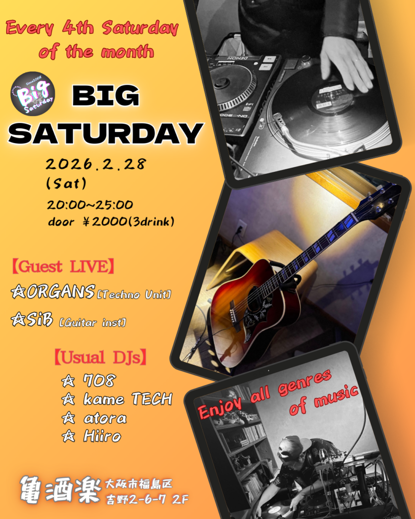 2026.02.28(Sat)BIG SATURDAY@亀酒楽(福島区野田) 2026.01.25 2026.01.25 Post Share Hatena Pocket RSS feedly Pin it 今年から月ごとにテーマを決めてやっていきます。2月はライブ月! 2026.02.28(Sat)BIG SATURDAY@亀酒楽(福島区野田) 20:00〜 Midnight3Drink ¥2000 【Guest Live】ORGANS(テクノユニット)Sib(ギターインスト) 【usual DJs】708atorakame TECHHiiro大阪市福島区吉野2−6−7 2F環状線野田駅から、新なにわ筋に向かって徒歩10分。 Screenshot Post Share Hatena Pocket RSS feedly Pin it この記事のタイトルとURLをコピーする The Flashcubes / Pop Masters 前の記事