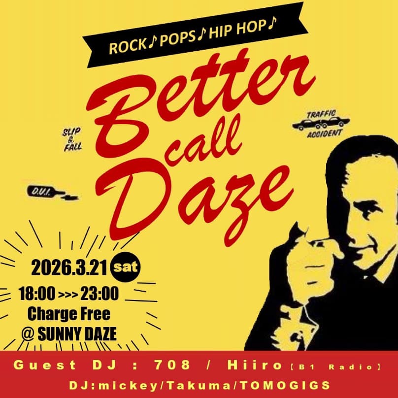 2026.03.21(Sat) Better Call Daze @SUNNY DAZE(なんば) 2026.03.01 2026.03.03 Post Share Hatena Pocket RSS feedly Pin it 残念ながら今年も1979-1980には不参加の同級生DJタクマが誘ってくれました。何気にサニーデイズでのDJは初めてなので楽しみ。 2026.03.21(Sat) Better Call Daze @SUNNY DAZE(なんば) 18:00〜23:00Charge Free Guest Dj708Hiiro (B1 Radio) DjmickeyTakumaTOMOGIGS Post Share Hatena Pocket RSS feedly Pin it この記事のタイトルとURLをコピーする 2026.03.05(Thu)桃ライトCALLING@桃ライト(心斎橋) 前の記事 2026.03.19(Thu) B1 Radio 〜Let’s Grab A Drink〜@日本橋R/H/B 次の記事